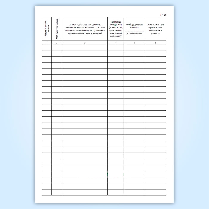 Форма книги записи ремонта локомотивов, моторвагонного подвижного состава железнодорожных кранов (ТУ-28) определяется Приложением к Инструктивным указаниям о порядке составления учетных форм по локомотивному хозяйству. МПС РФ, № ЦЧУЛ-68 от 30.09.1999 и предназначена для учета выполнения операций при ремонте и техническом обслуживании в депо локомотивов, моторвагонного подвижного состава и железнодорожных кранов, а также учета изменения характеристик локомотива, МВПС на основе результатов измерений, диагностики, испытаний и анализов.