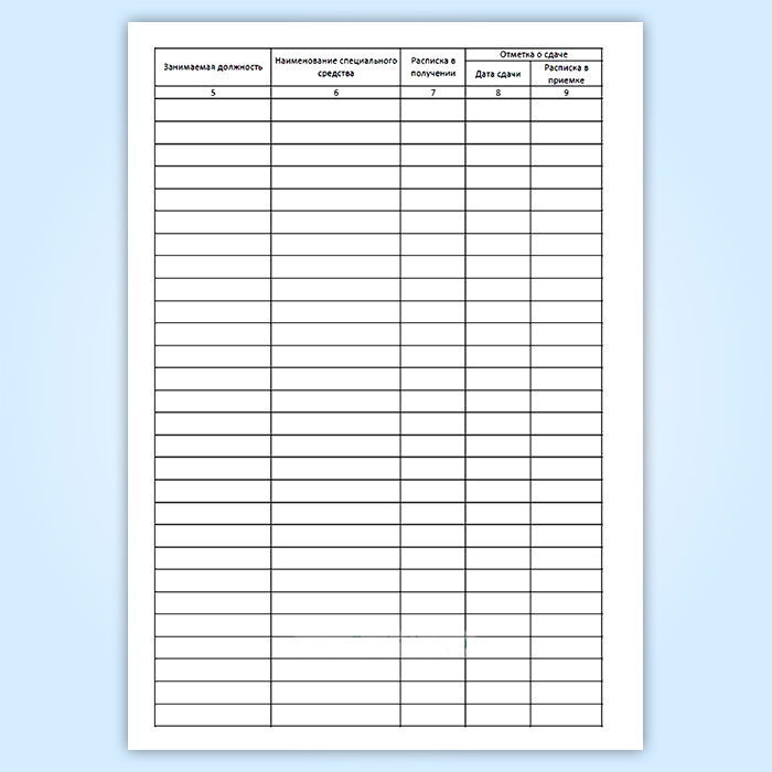 Книга приема и выдачи специальных средств Службы безопасности содержит графы: