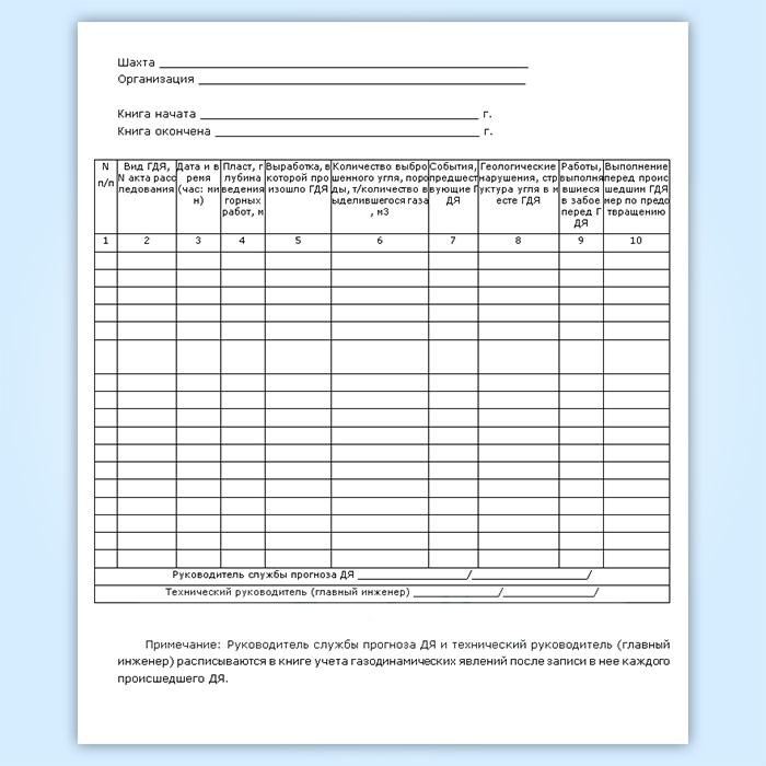 Форма Книги учета динамических явлений соответствует Приложению 14 к Рекомендациям по безопасному ведению горных работ на склонных к динамическим явлениям угольных пласта.