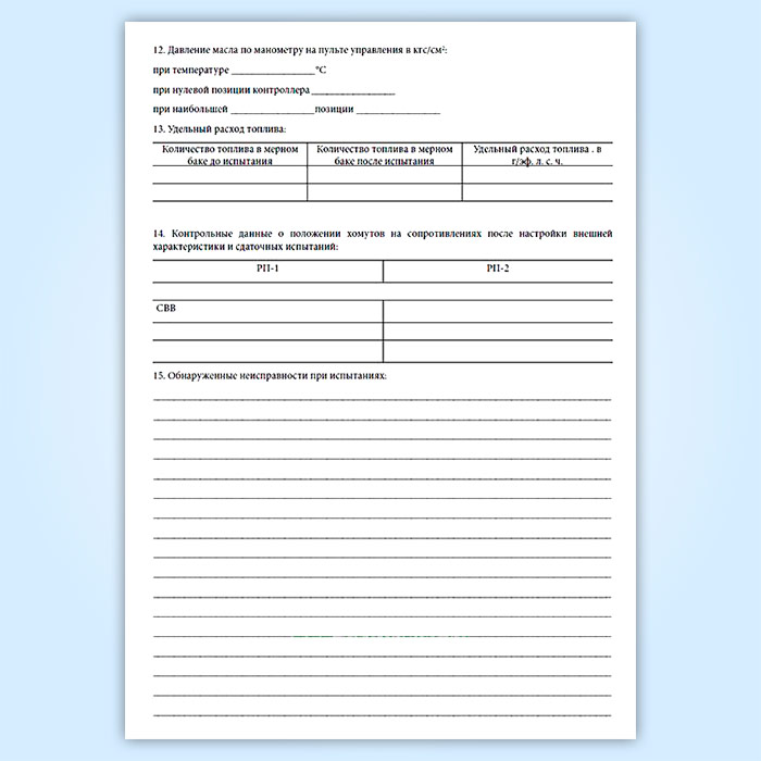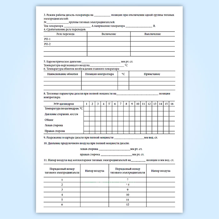 Результаты испытаний заносятся в настоящую форму, которая хранится в паспортах дизельного ТПС до следующих испытаний. Объем испытаний и записей устанавливается Правилами деповского ремонта ТПС или Инструкцией по настройке и регулированию ТПС соответствующих серий.