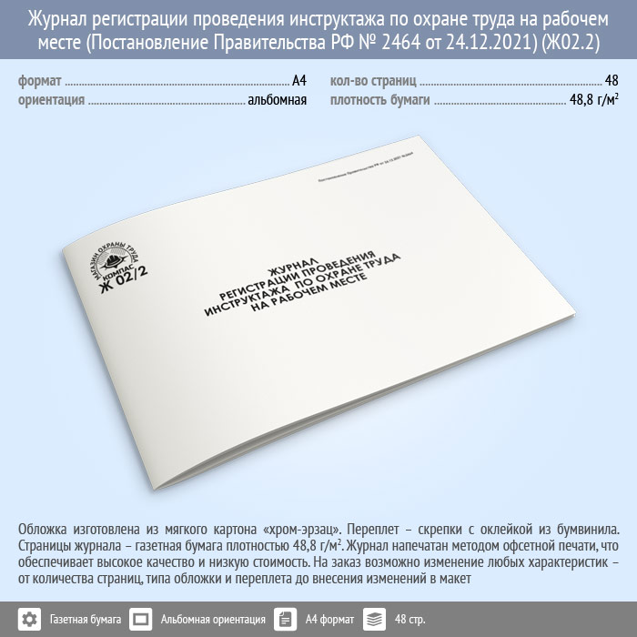 Журнал регистрации проведения инструктажа по охране труда на рабочем месте (Постановление Правительства РФ № 2464 от 24.12.2021) (48 стр., Ж02.2)