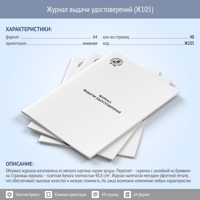 Заказывая Журнал выдачи удостоверений у нас, Вы можете выбрать любое исполнение обложки и количество страниц в нем. Согласно правилам, страницы журнала прошнуровываются и пронумеровываются. Оставшаяся часть шнура приклеивается к последней странице частью листа бумаги, на котором указывается количество страниц. Все скрепляется печатью организации и подписывается ответственным должностным лицом, ведущим учет журналов
