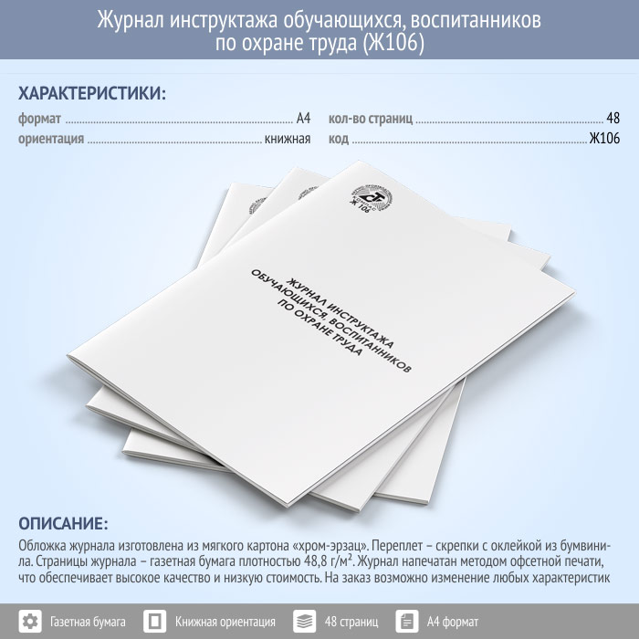 Журнал регистрации инструктажа учащихся по охране труда применяется в образовательных учреждениях, по своей структуре и смыслу повторяет Журнал регистрации инструктажа на рабочем месте. Данный журнал предназначен для учета и регистрации сведений о воспитанниках, прошедших инструктаж и о руководителях, проводивших инструктаж по охране труда. Обучение охране труда и техники безопасности для учеников школ, колледжей, институтов, вузов и других, учебных заведений это прекрасный шанс в формировании социальной ответственности с юных лет. Обучение по охране труда должно проводится на основании программы обучения разрабатываемой самим учебным учреждением по рекомендованным стандартам. Заказывая журнал у нас, Вы можете выбрать любое исполнение обложки и количество страниц