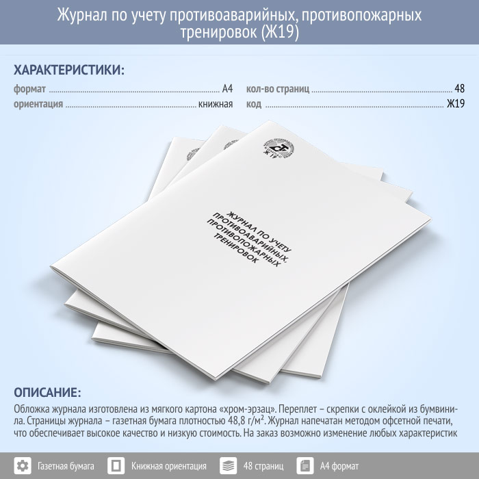 Заказывая Журнал учета противоаварийных, противопожарных тренировок у нас, Вы можете выбрать любое исполнение обложки и количество страниц в нем. Согласно правилам, страницы журнала прошнуровываются и пронумеровываются. Оставшаяся часть шнура приклеивается к последней странице частью листа бумаги, на котором указывается количество страниц. Все скрепляется печатью организации и подписывается ответственным должностным лицом, ведущим учет журналов