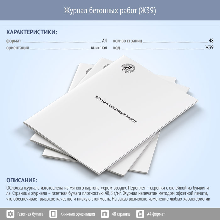 Заказывая Журнал бетонных работ у нас, Вы можете выбрать любое исполнение обложки и количество страниц в нем. Согласно правилам, страницы журнала прошнуровываются и пронумеровываются. Оставшаяся часть шнура приклеивается к последней странице частью листа бумаги, на котором указывается количество страниц. Все скрепляется печатью организации и подписывается ответственным должностным лицом, ведущим учет журналов