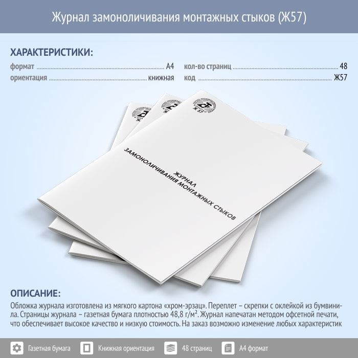 Заказывая Журнал замоноличивания монтажных стыков у нас, Вы можете выбрать любое исполнение обложки и количество страниц в нем. Согласно правилам, страницы журнала прошнуровываются и пронумеровываются. Оставшаяся часть шнура приклеивается к последней странице частью листа бумаги, на котором указывается количество страниц. Все скрепляется печатью организации и подписывается ответственным должностным лицом, ведущим учет журналов