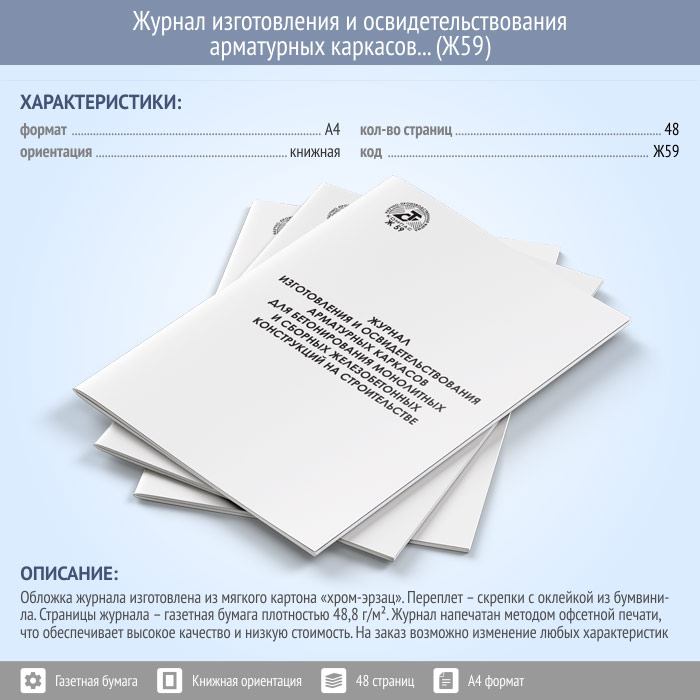 Журнал изготовления и освидетельствования арматурных каркасов для бетонирования монолитных и сборных железобетонных конструкций на строительстве (Ф-48) (48 стр., Ж59)