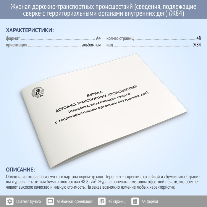 Журнал дорожно-транспортных происшествий (сведения, подлежащие сверке с территориальными органами внутренних дел) (48 стр., Ж84)