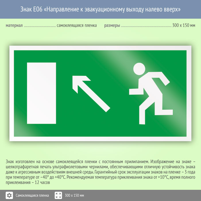 Знак «Направление к эвакуационному выходу налево вверх» направляет к выходу налево и наверх. Код знака: E06