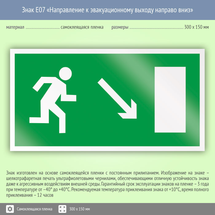Знак E07 Направление к эвакуационному выходу направо вниз