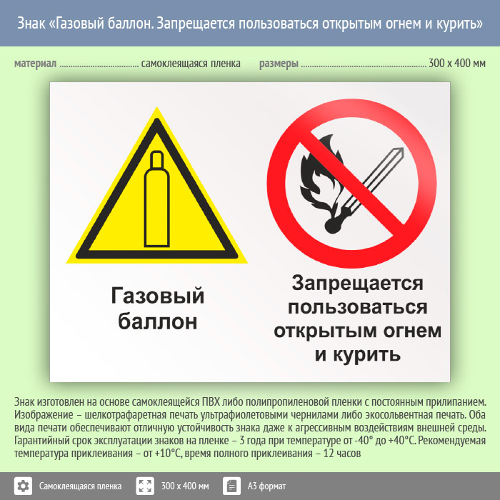 Знак «Газовый баллон. Запрещается пользоваться открытым огнем и курить» может быть изготовлен любого размера на самоклеящейся пленке, пластике толщиной 0.5, 2 или 4 мм и металле. Также возможно применение фотолюминесцентных и световозвращающих материалов