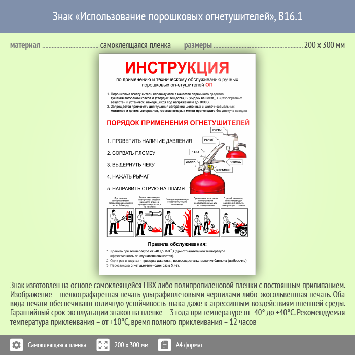 Знак «Использование порошковых огнетушителей» может быть изготовлен любого размера на самоклеящейся пленке, пластике толщиной 0.5, 2 или 4 мм и металле. Также возможно применение фотолюминесцентных и световозвращающих материалов