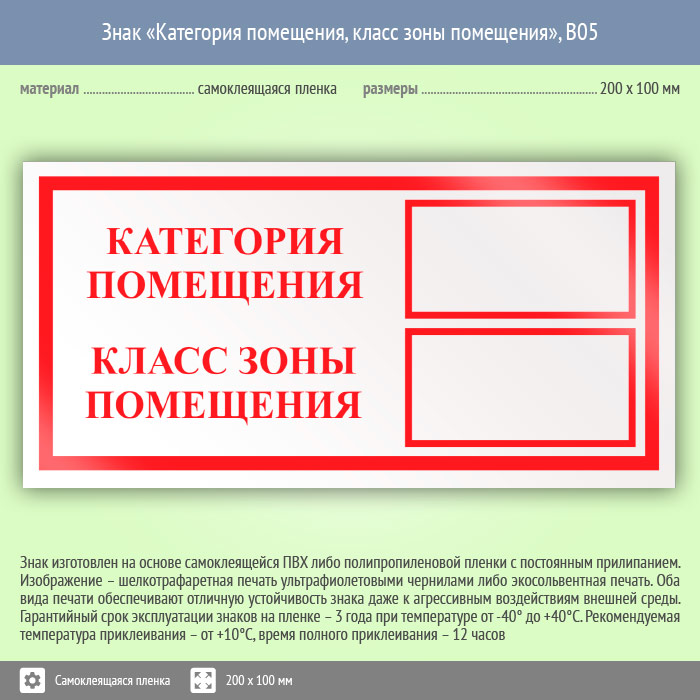 Знак «Категория помещения, класс зоны помещения», B05 предназначен для информирования о категории взрыво- и пожароопасности помещения и классе зоны помещения