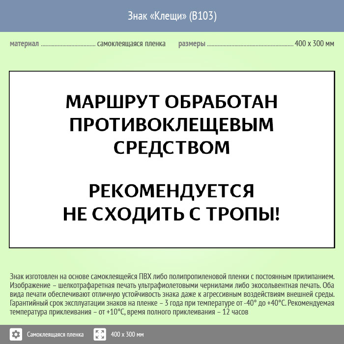 Знак «Клещи», B103 изготавливается в 2-х типоразмерах - 300х200 мм и 400х300 мм, но также может быть изготовлен любого размера на самоклеящейся пленке с ламинированием и без, пластике толщиной 0.5, 2 или 4 мм и металле. Также возможно применение фотолюминесцентных и световозвращающих материалов