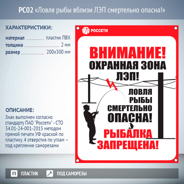 Знаки безопасности и информационные щиты «Ловля рыбы вблизи ЛЭП смертельно опасна!» выполнены согласно стандарта ПАО «Россети» – СТО 34.01-24-001-2015 методом прямой печати УФ краской по ПВХ-пластику (толщиной 2 мм) либо оцинкованному металлу (толщиной 0,8 мм с полимерным покрытием). Размеры знаков – 200×300 мм, размеры щитов – 700×500 мм. С обратной стороны щита находятся Z–образные кронштейны для крепления на стойку. Для крепления знаков предусмотрены 4 отверстия по углам – под крепление саморезами на деревянную опору и в моделях с отверстиями под бандажную ленту – 8 отверстий для крепления на бетонную и металлическую опоры. Также есть версии без отверстий