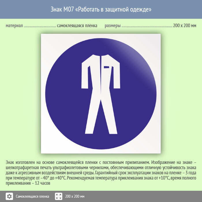 Знак «Работать в защитной одежде» имеет размер 200х200 мм