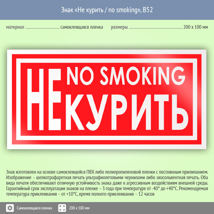 Знак «Не курить / no smoking» имеет размер 200х100 мм