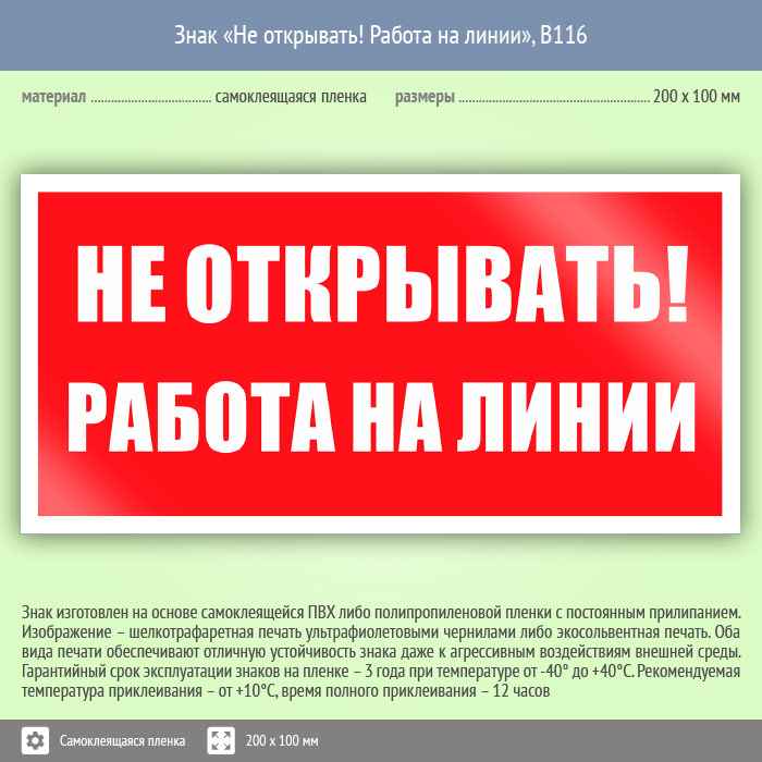 Знак «Не открывать! Работа на линии» может быть изготовлен любого размера на самоклеящейся пленке, пластике толщиной 0.5, 2 или 4 мм и металле. Также возможно применение фотолюминесцентных и световозвращающих материалов
