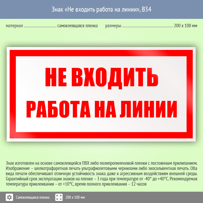 Знак «Не входить работа на линии» может быть изготовлен любого размера на самоклеящейся пленке, пластике толщиной 0.5, 2 или 4 мм и металле. Также возможно применение фотолюминесцентных и световозвращающих материалов