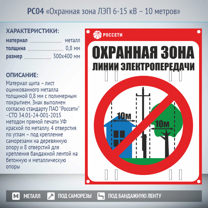 Знаки безопасности «Охранная зона ЛЭП...» выполнены согласно стандарта ПАО «Россети» — СТО 34.01-24-001-2015 методом прямой печати УФ краской по ПВХ-пластику (толщиной 2 мм) либо оцинкованному металлу (толщиной 0,8 мм с полимерным покрытием). Размеры знаков — 300×400 мм либо 400×550 мм. Для крепления знаков предусмотрены 4 отверстия по углам — под крепление саморезами на деревянную опору и 8 отверстий для крепления бандажной лентой на бетонную и металлическую опоры. Также есть версии без отверстий