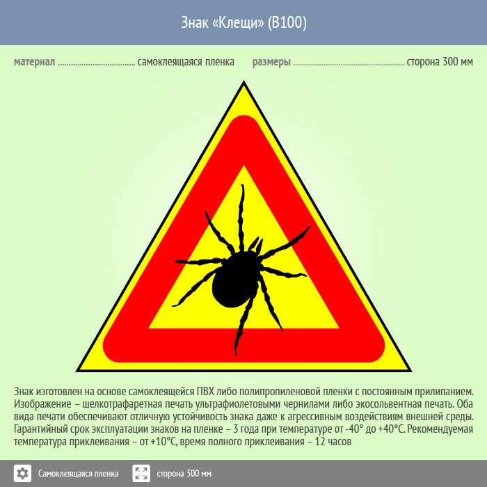 Знак «Опасно! Клещи» может быть изготовлен любого размера на самоклеящейся пленке с ламинированием и без, пластике толщиной 0.5, 2 или 4 мм и металле. Также возможно применение фотолюминесцентных и световозвращающих материалов