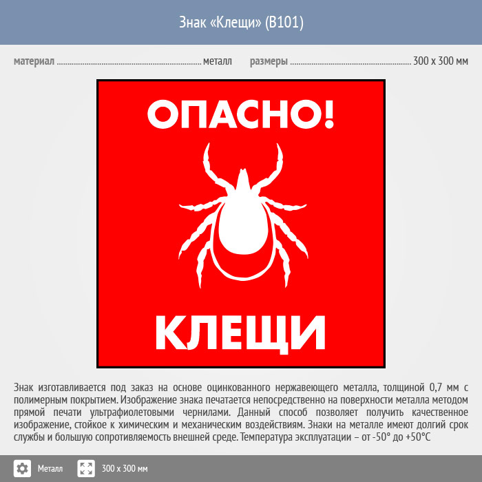 Знак «Опасно! Клещи», B101 изготавливается в 2-х типоразмерах - 200х200 мм и 300х300 мм