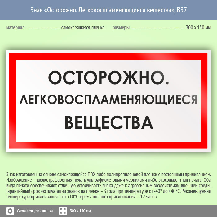 Табличка «Осторожно. Легковоспламеняющиеся вещества» служит для обозначения горючих веществ, предупреждая о возможной опасности. Код знака: B37