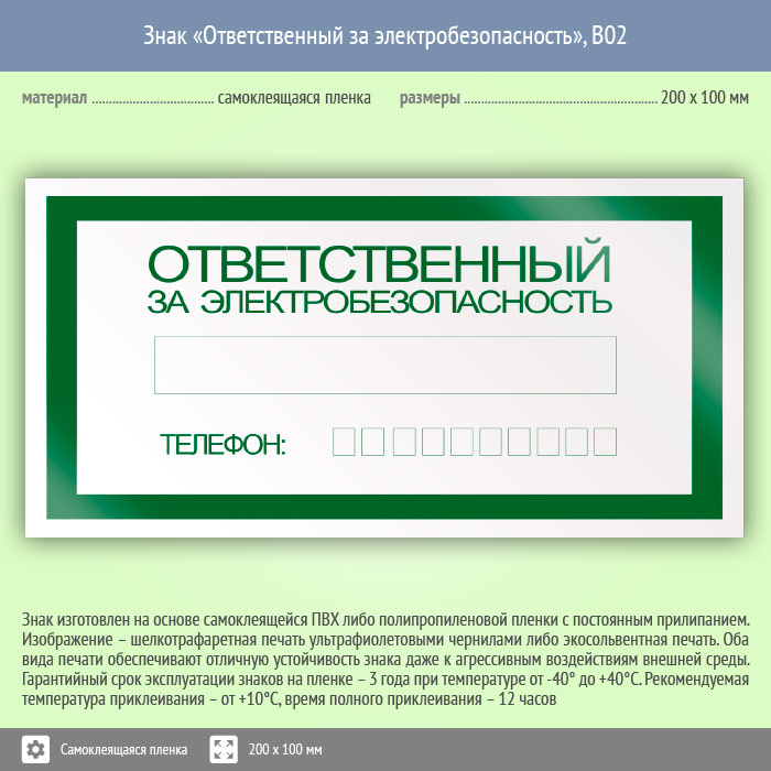 Знак «Ответственный за электробезопасность» может быть изготовлен любого размера на самоклеящейся пленке, пластике толщиной 0.5, 2 или 4 мм и металле. Также возможно применение фотолюминесцентных и световозвращающих материалов