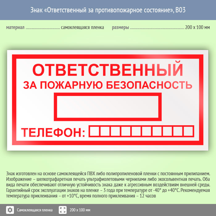Табличка «Ответственный за пожарную безопасность» предназначена для информирования об ответственном за пожарную безопасность. Код знака: B03