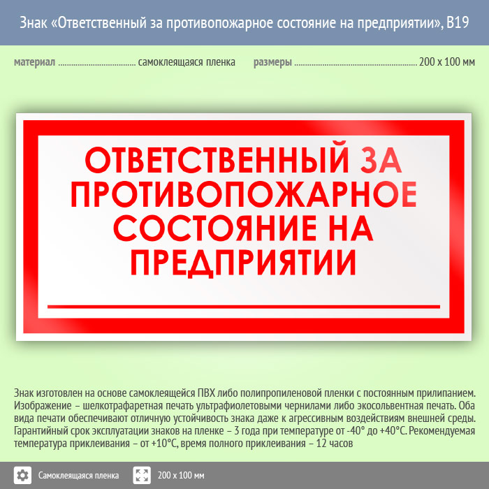 Знак «Ответственный за противопожарное состояние на предприятии», B19
