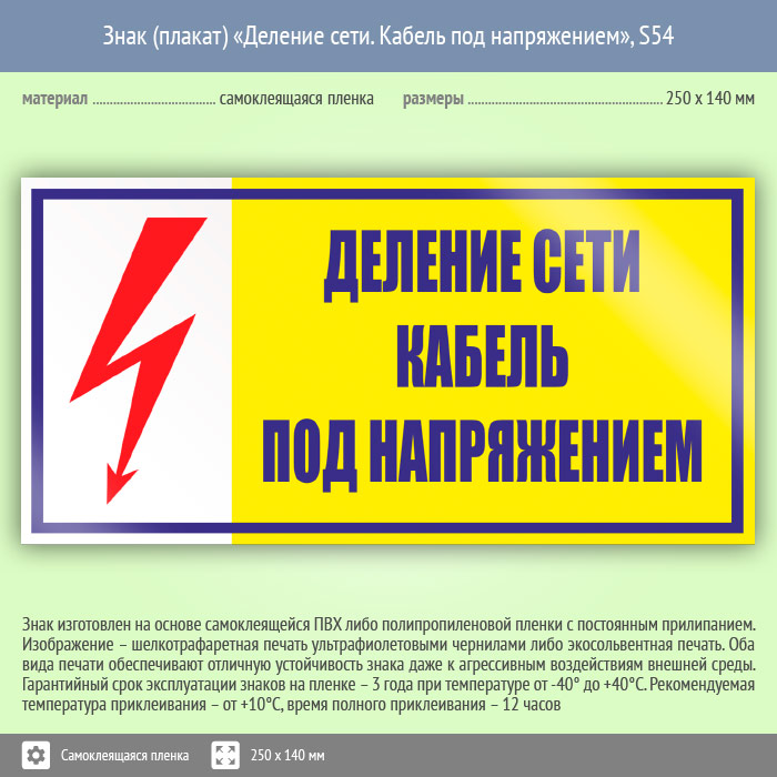 Знак (плакат) «Деление сети. Кабель под напряжением», S54