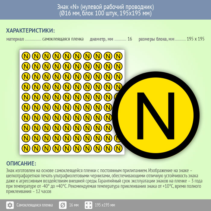 Наклейка «N» (код S47) - это информационный знак, который размещается для информирования о характеристике напряжения в электрической сети (нулевой провод-нейтраль) около розеток и выключателей. Такие наклейки предназначены для предупреждения и информирования окружающих, а также для организации мест работы электромонтажных бригад, несут дополнительную информационную нагрузку