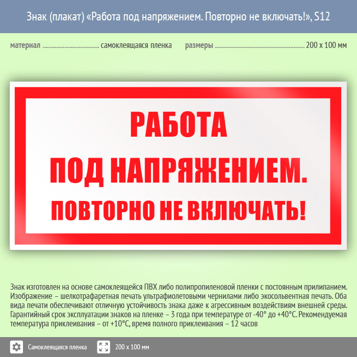 Знак «Работа под напряжением. Повторно не включать!» может быть изготовлен любого размера на самоклеящейся пленке, пластике толщиной 0.5, 2 или 4 мм и металле. Также возможно применение фотолюминесцентных и световозвращающих материалов