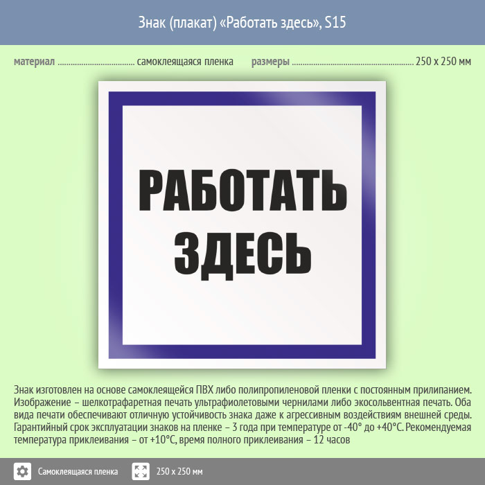 Знак «Работать здесь» может быть изготовлен любого размера на самоклеящейся пленке, пластике толщиной 0.5, 2 или 4 мм и металле. Также возможно применение фотолюминесцентных и световозвращающих материалов