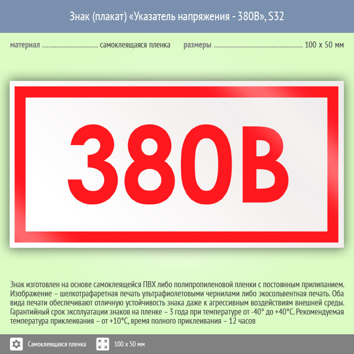 Табличка «Указатель напряжения – 380В» размещают в местах с электрическим напряжением в 380 вольт. Код знака: S32