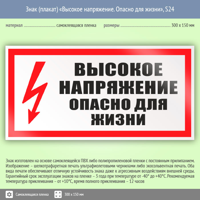 Табличка «Высокое напряжение. Опасно для жизни» предупреждает о том, что здесь присутствует высокое напряжение, представляющее угрозу для жизни. Код знака: S24