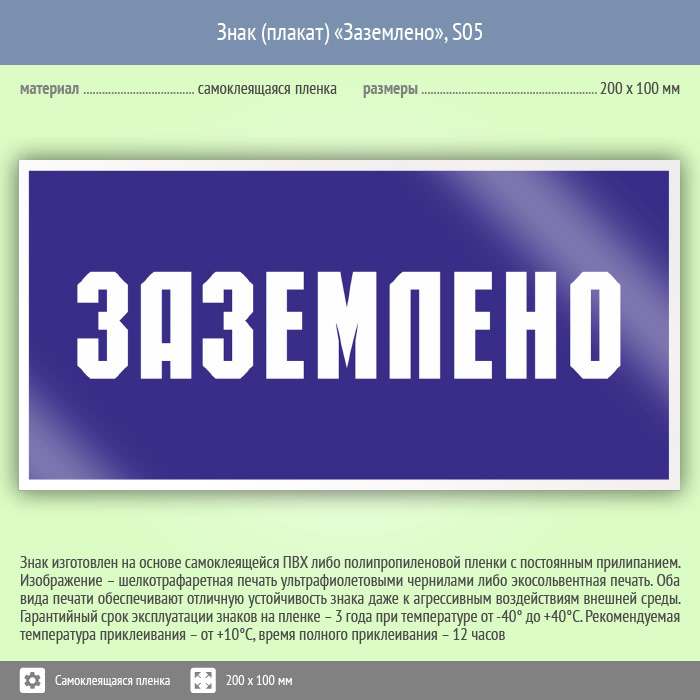 Знак «Заземлено» может быть изготовлен любого размера на самоклеящейся пленке, пластике толщиной 0.5, 2 или 4 мм и металле. Также возможно применение фотолюминесцентных и световозвращающих материалов