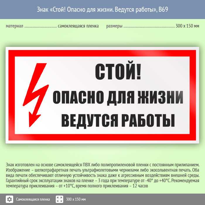 Знак «Стой! Опасно для жизни. Ведутся работы» может быть изготовлен любого размера на самоклеящейся пленке, пластике толщиной 0.5, 2 или 4 мм и металле. Также возможно применение фотолюминесцентных и световозвращающих материалов