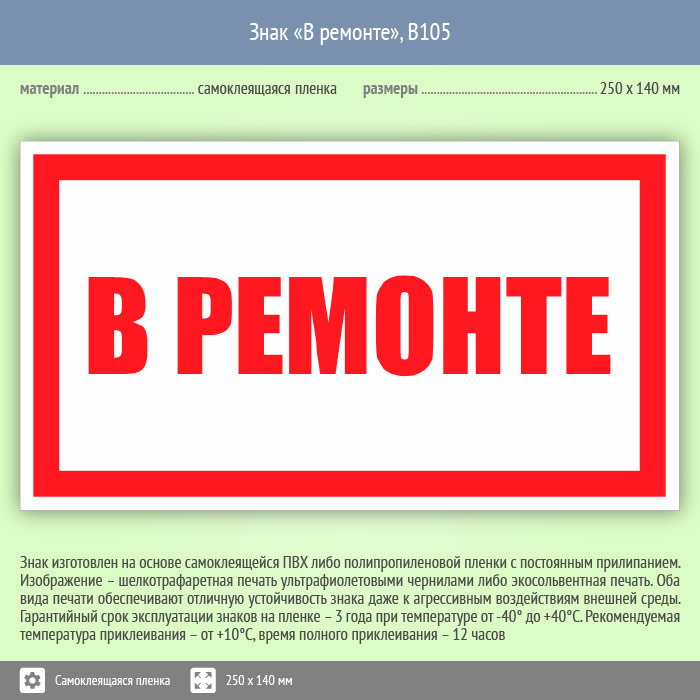 Знак «В ремонте» может быть изготовлен любого размера на самоклеящейся пленке, пластике толщиной 0.5, 2 или 4 мм и металле. Также возможно применение фотолюминесцентных и световозвращающих материалов