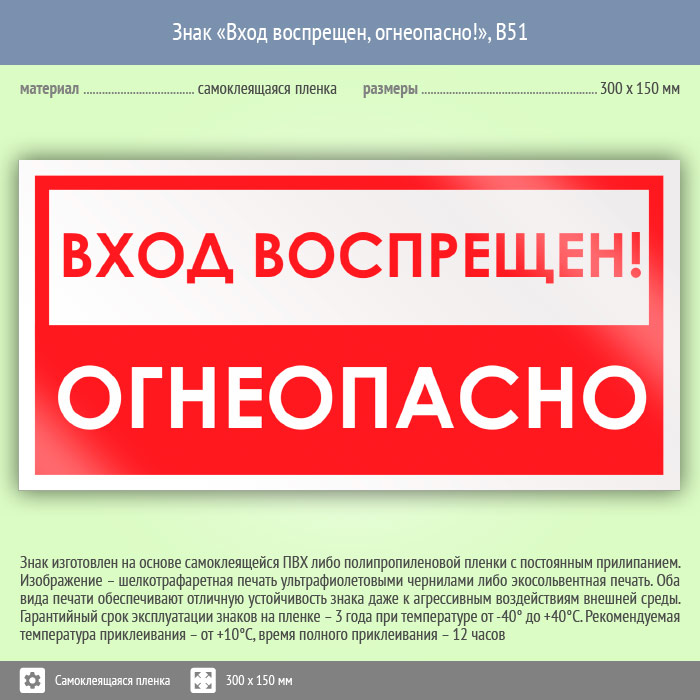 Знак «Вход воспрещен, огнеопасно!» может быть изготовлен любого размера на самоклеящейся пленке, пластике толщиной 0.5, 2 или 4 мм и металле. Также возможно применение фотолюминесцентных и световозвращающих материалов