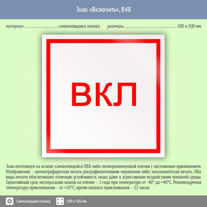 Знак «Включить» может быть изготовлен любого размера на самоклеящейся пленке, пластике толщиной 0.5, 2 или 4 мм и металле. Также возможно применение фотолюминесцентных и световозвращающих материалов
