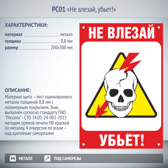 Знак безопасности «Не влезай, убьет!» выполнен согласно стандарта ПАО «Россети» – СТО 34.01-24-001-2015 методом прямой печати УФ краской по металлу. Материал знака – лист оцинкованного металла толщиной 0,8 мм с полимерным покрытием. Размеры знака – 200×300 мм. Знак имеет 4 отверстия по углам – под крепление саморезами