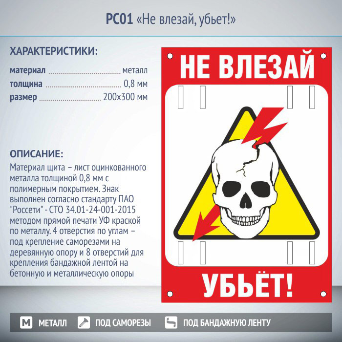 Знак безопасности «Не влезай, убьет!» выполнен согласно стандарта ПАО «Россети» – СТО 34.01-24-001-2015 методом прямой печати УФ краской по металлу. Материал знака – лист оцинкованного металла толщиной 0,8 мм с полимерным покрытием. Размеры знака – 200×300 мм. Знак имеет 4 отверстия по углам – под крепление саморезами на деревянную опору и 8 отверстий для крепления бандажной лентой на бетонную и металлическую опоры