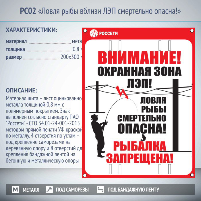 Знак безопасности «Ловля рыбы вблизи ЛЭП смертельно опасна!» выполнен согласно стандарта ПАО «Россети» – СТО 34.01-24-001-2015 методом прямой печати УФ краской по металлу. Материал знака – лист оцинкованного металла толщиной 0,8 мм с полимерным покрытием. Размеры знака – 200×300 мм. Знак имеет 4 отверстия по углам – под крепление саморезами на деревянную опору и 8 отверстий для крепления бандажной лентой на бетонную и металлическую опоры