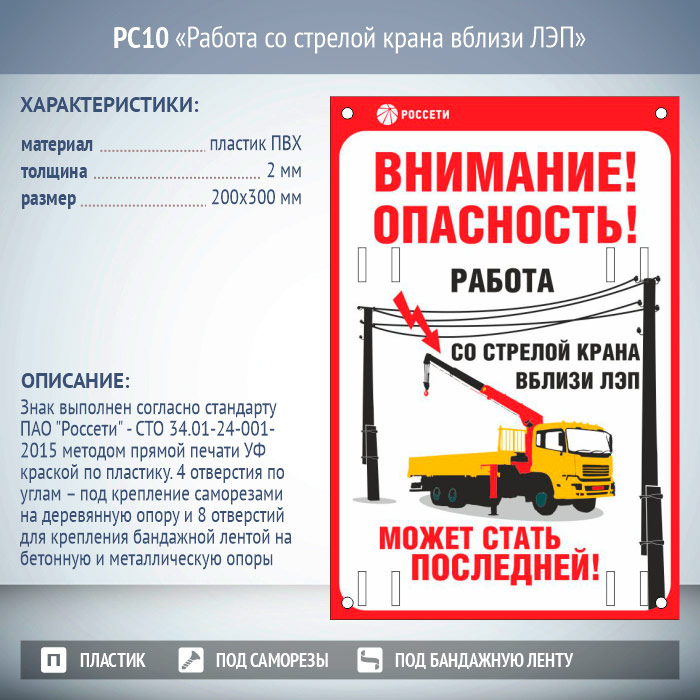 Знак безопасности «Работа со стрелой крана вблизи ЛЭП» выполнен согласно стандарта ПАО «Россети» – СТО 34.01-24-001-2015 методом прямой печати УФ краской по пластику. Материал знака – пластик ПВХ, толщиной 2 мм. Размеры знака – 200×300 мм. Знак имеет 4 отверстия по углам – под крепление саморезами на деревянную опору и 8 отверстий для крепления бандажной лентой на бетонную и металлическую опоры