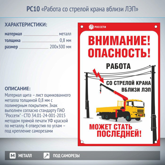 Знак безопасности «Работа со стрелой крана вблизи ЛЭП» выполнен согласно стандарта ПАО «Россети» – СТО 34.01-24-001-2015 методом прямой печати УФ краской по металлу. Материал знака – лист оцинкованного металла толщиной 0,8 мм с полимерным покрытием. Размеры знака – 200×300 мм. Знак имеет 4 отверстия по углам – под крепление саморезами
