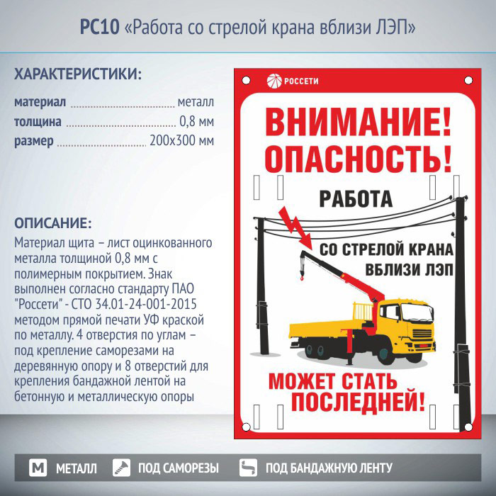 Знак безопасности «Работа со стрелой крана вблизи ЛЭП» выполнен согласно стандарта ПАО «Россети» – СТО 34.01-24-001-2015 методом прямой печати УФ краской по металлу. Материал знака – лист оцинкованного металла толщиной 0,8 мм с полимерным покрытием. Размеры знака – 200×300 мм. Знак имеет 4 отверстия по углам – под крепление саморезами на деревянную опору и 8 отверстий для крепления бандажной лентой на бетонную и металлическую опоры