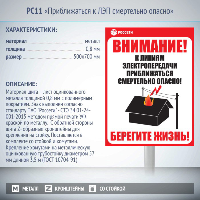 Информационный щит «Приближаться к ЛЭП смертельно опасно!» выполнен согласно стандарта ПАО «Россети» – СТО 34.01-24-001-2015 методом прямой печати УФ краской по металлу. Материал щита – лист оцинкованного металла толщиной 0,8 мм с полимерным покрытием. Размеры щита – 500×700 мм. С обратной стороны щита Z–образные кронштейны для крепления на стойку. Поставляется в комплекте со стойкой и хомутами. Крепление хомутами на металлическую оцинкованную трубостойку диаметром 57 мм длиной 3,5 м (ГОСТ 10704-91)