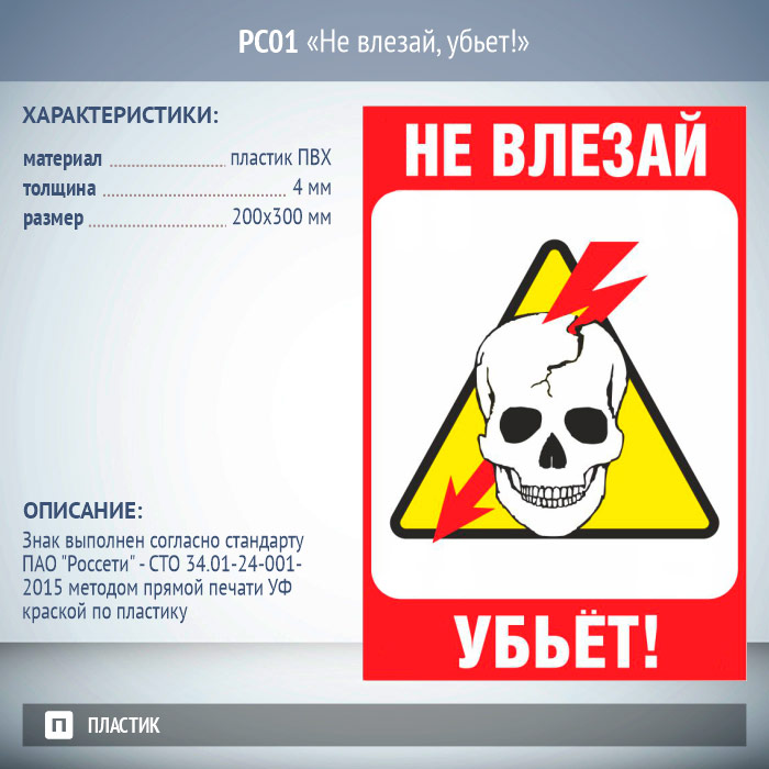 Знак безопасности «Не влезай, убьет!» выполнен согласно стандарта ПАО «Россети» – СТО 34.01-24-001-2015 методом прямой печати УФ краской по пластику. Материал знака – пластик ПВХ, толщиной 2 мм. Размеры знака – 200×300 мм