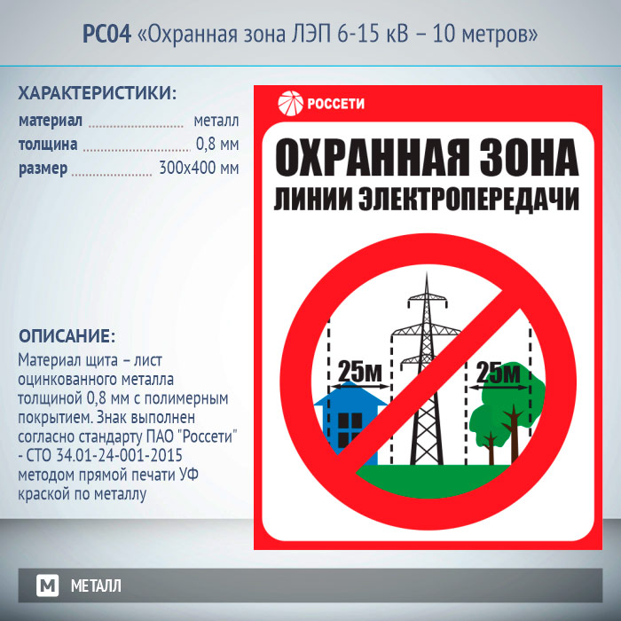 Знак безопасности «Охранная зона ЛЭП 6-15 кВ – 10 метров» выполнен согласно стандарта ПАО «Россети» – СТО 34.01-24-001-2015 методом прямой печати УФ краской по металлу. Материал знака – лист оцинкованного металла толщиной 0,8 мм с полимерным покрытием. Размеры знака – 300×400 мм